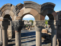 This marvelous temple is a result of skillfulness and brave creativity of Armenian architects of the 7th century. Having been built on several columns it could survive only till the 10th century. When in the beginning of the 20th century this site was being excavated many specialists could hardly accept its reconstruction model designed by famous Armenian architect Toros Toramanyan as it was difficult to believe that such a huge and complicated construction could have been built those days, and amazingly at that time one of the bas-relieves of St. Chapelle church in Paris came to prove Toramanyan's version; the bas-relief depicts Zvartnots temple with Noah's Ark and it looks like the model represented by the architect.